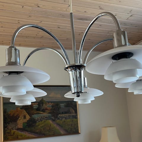 Louis Poulsen loftpendel ,forkromet metal med 2/1 opal skærme som ny ,incl loft baldakin i krom .