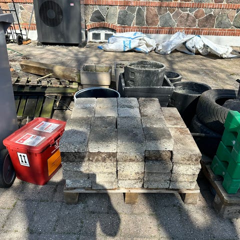 Betonfliser og kantsten i grå farve. Forskellige former og størrelser, velegnet til belægning, havestier eller som kantafgrænsning i have og indkørsel. Fliserne er stablet på paller og ligger løst på jorden, klar til afhentning og videre brug i udendørs projekter.