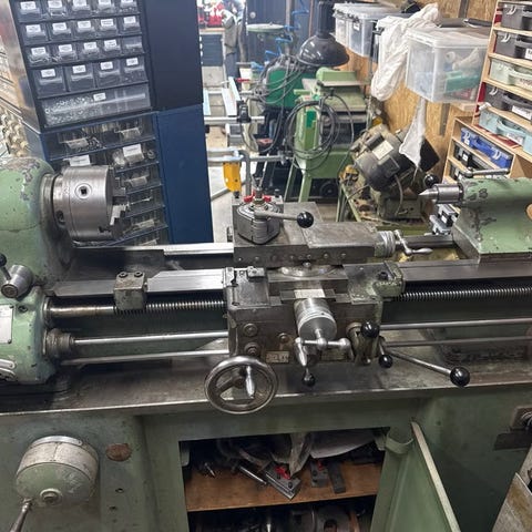 AUD drejebænk til metalbearbejdning i grøn udførelse. Drejebænken er udstyret med gearkasse til gevindskæring og fødning, tværslæde og topslæde med værktøjsholder, samt trebakke-patron. Maskinen står på integreret understel med skabsplads og betjeningspanel på fronten. På bagvæggen ses forskelligt tilbehør og opspændingsværktøj, som kan anvendes til forskellige drejeopgaver i metalværksted eller hobbyværksted.Med bænken medfølger rullepinol borepatron hurtigskift med 4 holder mt2 centerbor firklo er32 holder med gevind til hovedspindel samt div hss/hårdmetalbits.længde 1200mm brede 450 mm højde1200 mm vægt 275kg. Ved hurtig handel medfølger vfd til 230volt- 3 faser.