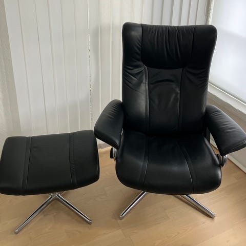 Læderlænestol med indbygget fodskammel som aktiveres ved et let tryk under armlæn
