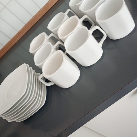 Churchill Chateau Damask kaffestel i hvidt porcelæn. Stellet er mærket “Damask – KeraFine Hotelware – Churchill – Chateau – Made in England”. Delene har præget bort og diskret mønster langs kanterne. Velegnet som kaffestel til hverdag eller servering ved gæster. Antal og præcise mål af de enkelte dele kan oplyses af sælger efter behov.