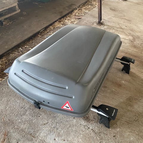 Tagboks med tilhørende tagbøjler. Tagboksen er lys i farven, og tagbøjlerne er sorte. Egnet til montering på bilens tag for ekstra opbevaringsplads til f.eks. bagage eller udstyr på ture og ferier.