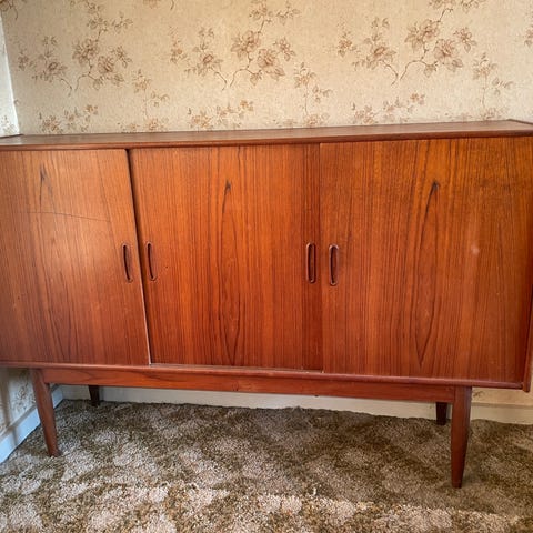 Fin lille sænk i teak med udtræksplade. I rimelig god stand. Har dog et par skjolder øverst som kan slibes væk. Derudover et par mindre hakker i træet (se billeder). Nederste skuffe er lidt stram. Kan sikkert fikses.