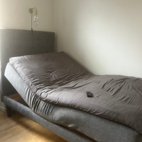 Elevationsseng 120x200. Standen er god, pånær bøjlen på fjernbetjeningen til at hænge på sengekanten, som er knækket af (se billede).