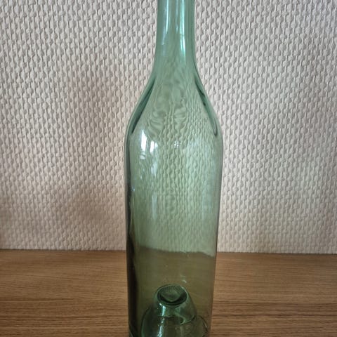 Super flot og tung antik flaske i en dyb grøn farve. Den er fra 1934 og har masser af karakter med flotte detaljer i glasset fra den gamle produktionsmetode. Den føles solid og er af meget kraftigt glas. En unik genstand til indretningen.