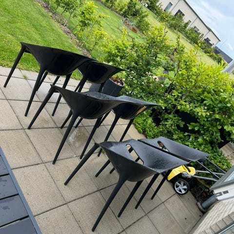 Der er 7 stole og de er stabelbare stk. pris 125, samlet pris 500