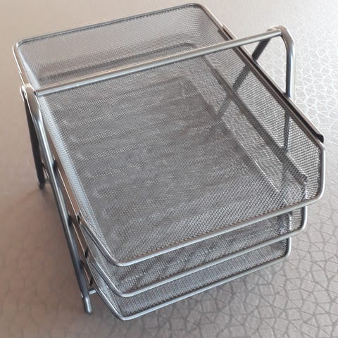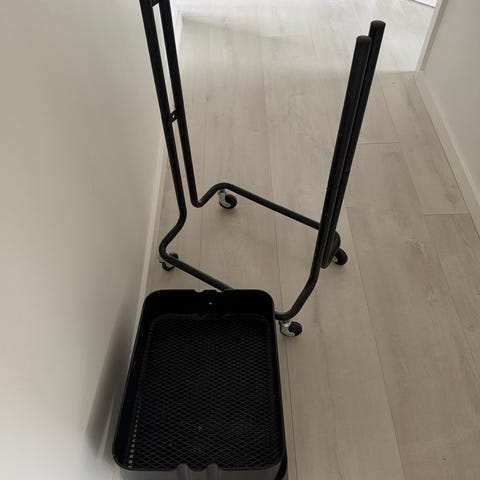 Rullebord med 3 kurve i sort metal. Vognen har tre rektangulære kurve med perforerede sider og bund, monteret på en ramme med hjul. Velegnet til opbevaring i f.eks. køkken, badeværelse, kontor eller garderobe, hvor der er behov for mobil og åben opbevaring.