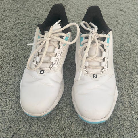 FootJoy golfsko i hvid med sorte detaljer i størrelse 36,5 Skoene har snørelukning og mønstret indersål. Ydersålen er udstyret med udskiftelige softspikes, som giver godt greb på golfbanen. Velegnet som golfsko til brug på både tørre og fugtige fairways.