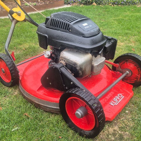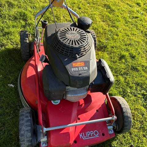 Klippo Pro S plæneklipper i rød med benzindrevet Intek 55 motor. Starter fint , fungerer 100 % .mener at det er en 2006 årgang , Ny kniv , nye trækhjul ( gummi ) .