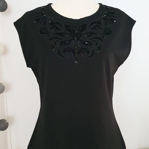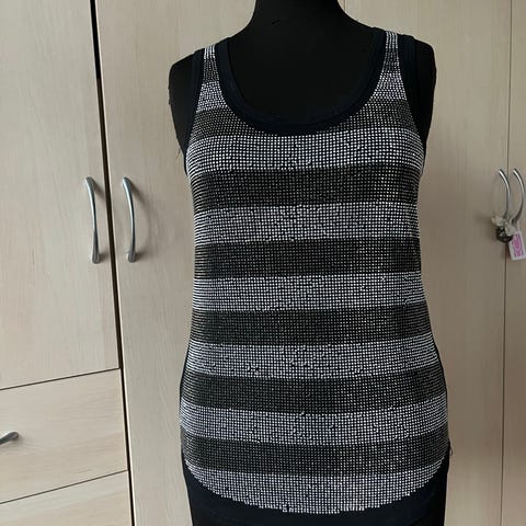 Festlig top i farven sort m. palietter. Str. M. Længden fra nakken og ned er 60 cm.
