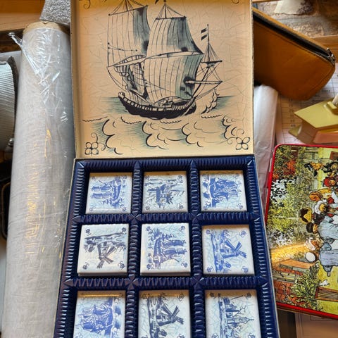 Formodentlig engelsk omk, 1900, sælges. Kaklen har tydelige brugsbrugsspor i form af afslag på kanterne og ridser på motivfladen.