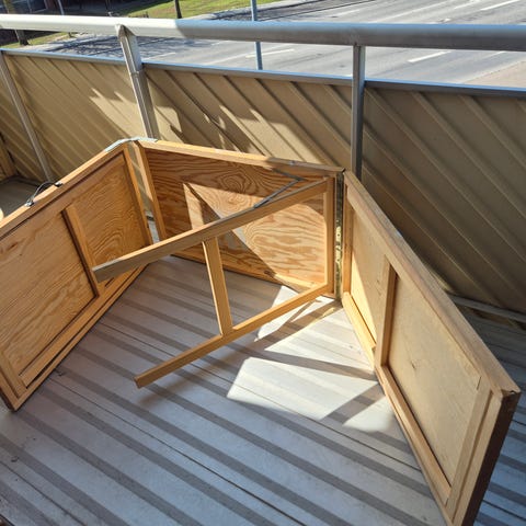 Uden mærke metalramme reolsystem til udendørs opbevaring. Konstruktionen består af en galvaniseret metalramme med lodrette skillevægge i plademateriale. Systemet er egnet til opdeling og organisering af opbevaringsplads, f.eks. til affaldscontainere, brænde eller andet udstyr i haven eller carporten. Placering på grusunderlag giver mulighed for dræn og stabilitet. Kan tilpasses efter behov ved montering af yderligere beklædning eller låger, afhængigt af anvendelse.