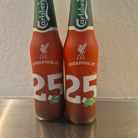 Limited edition "Red Hop" beer bottle produced by Carlsberg to celebrate their 25-year partnership with Liverpool FC.