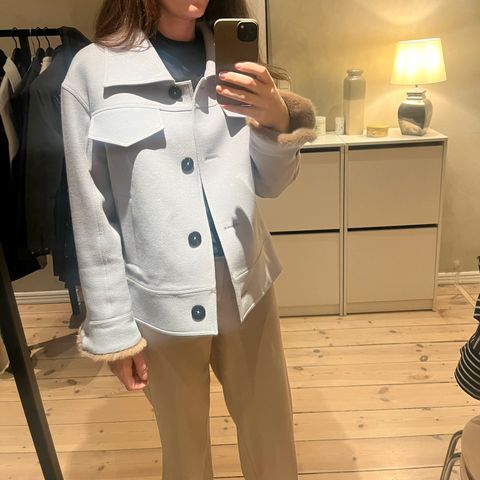 Kort pels i hvid mink. Ægte pels. Intet mærke. Str. 36. Det har været min mosters, som har fået den lavet til sig selv. Den har tre kroglukninger foran plus én i kraven, som kan foldes op i halsen. Fejler ingenting og er ikke slidt.