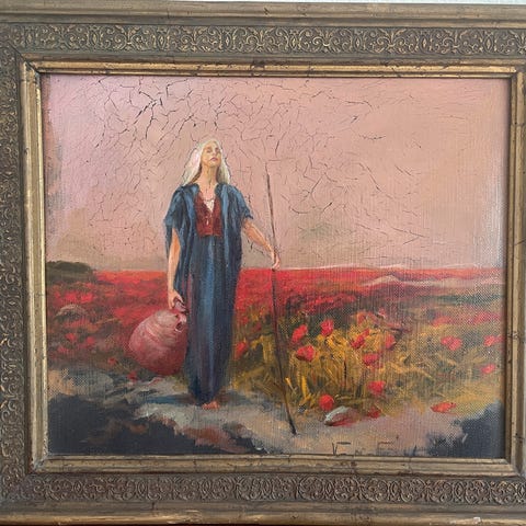 Motivet "kone ved spinderokken" er en klassisk genre i dansk kunst, der skildrer hjemlig idyl, landboliv og traditionelt håndværk. Rammemål: højde 72,5 cm bredde 61,5 cm