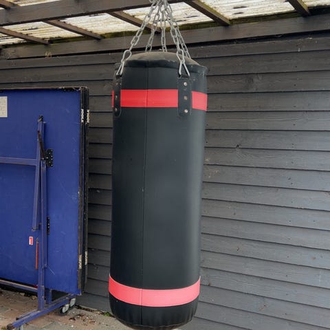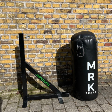 RBK sandsæk i sort med lys kontrastbund. Sandsækken er ophængt i kæder og karabinhager i en vægmonteret holder, som fremgår af billederne. Velegnet til boksetræning, sparketræning og generel konditions- og styrketræning derhjemme eller i mindre træningsrum.