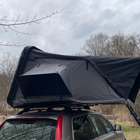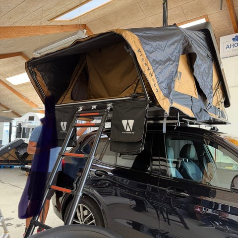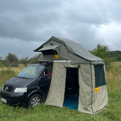 Gimle tagtelt campingtelt i beige og rød. Teltet er monteret på en fast bundplade og er beregnet til montering på bilens tagbagagebærer. Indvendigt er der liggeflade med madras. Yderteltet har åbning i enden med lynlås og vinduer i klar plast. Velegnet som soveløsning på bilferier og campingture, hvor teltet transporteres på taget og slås ud ved overnatning.