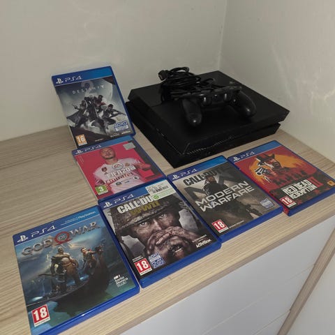 Sony PlayStation 4 spil og DualShock 4 controllere. Sættet omfatter to DualShock 4 trådløse controllere i farverne sort og hvid samt flere PS4-spil, herunder blandt andet FIFA 18, FIFA 19, Pro Evolution Soccer 2018 og Battlefield. Velegnet til brug med PlayStation 4-konsoller til lokal multiplayer og almindelig gaming.