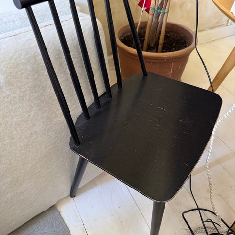 Tre af dem er de klassiske FDB J77 pindestole. Den sidste er også en J77 men produceret af Hay.