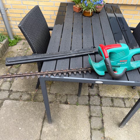 Bosch AHS 6000 PRO T hækkeklipper med 700W elmotor. Drift ved 230V~ 50Hz, 2,0A. Maskinen er udstyret med langt sværd og beskyttelsesskærm foran håndtaget. Egnet til trimning og klipning af hække og buske i haven.