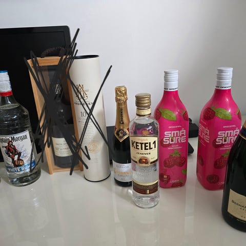 Sælger en samling blandet spiritus som vist på billedet. Perfekt til fest, hjemmebar eller arrangement. 12 flasker i alt.
