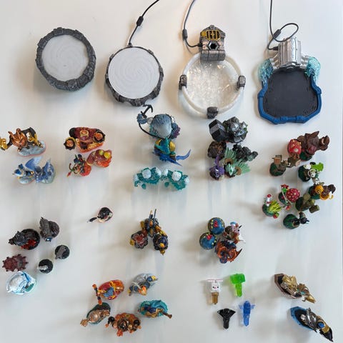 Skylanders figur-samling med blandede figurer i forskellige farver og elementer. På billederne ses et større antal figurer fra flere Skylanders-serier, en portal samt kabler. Der medfølger også mindst ét Skylanders-spil i originalt cover. Sættet kan bruges sammen med kompatible konsoller og Skylanders-spil, hvor figurerne placeres på portalen for at blive aktiveret i spillet. Antallet af figurer og præcise serier kan optælles ud fra billederne.