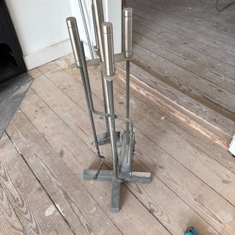 Lille pejsesæt med stativ , "skovl" , skraber og ringkrog - sidstnævnte er ikke normal tilbehør.