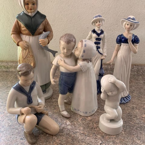 Kongeligt porcelæn og B&G 22, 24, 2x19 en pige og en dreng, 2x14 en pige og en dreng, 28 1636. Jeg kan ikke tyde dem alle, spørg endelig om billeder. Nr. 19 damen med gæs har knækket lidt af næsen