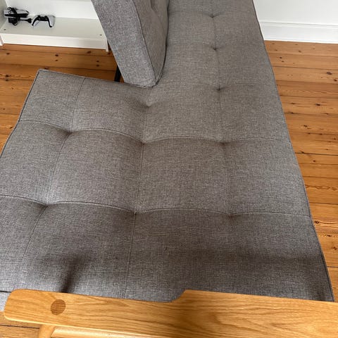 Længde 1,95 meter, 1,2 meter i udslået tilstand. Næsten ikke brugt, står på et gæsteværelse. Grå velour