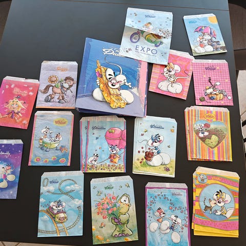 18 stk Diddl papirposer (de 14 stk er ens) + 2 stk øvrige Diddl papirposer. 20 stk Diddl poser i alt. Mål 21x15cm.