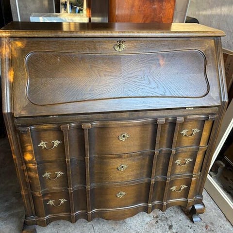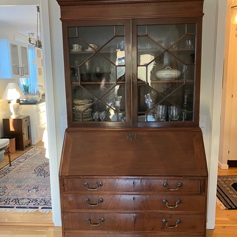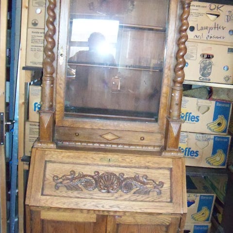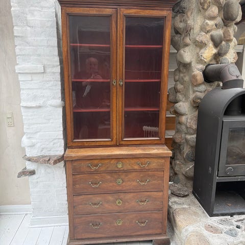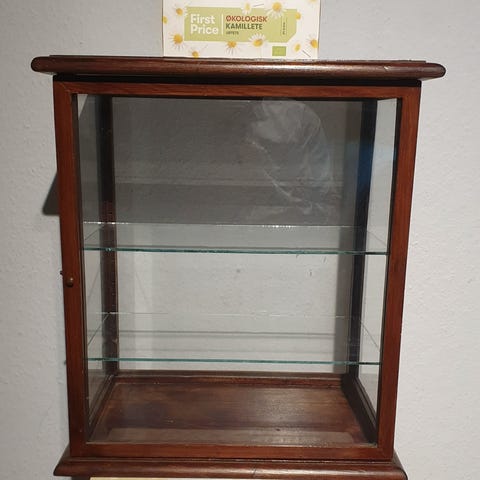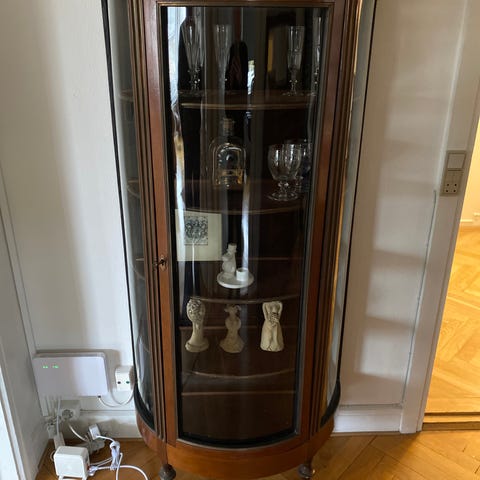 Vitrineskab og skrivebord i mørkt træ. Øverste del har glaslåger med sprosser og hylder til opbevaring af glas og service. Nederste del består af en skriveklap med små skuffer og rum, samt skuffer nederst til ekstra opbevaring. Egnet til brug i stue, spisestue eller kontor til opbevaring og udstilling af glas, porcelæn eller andre genstande.