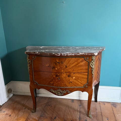 Lille antik kommode med grøn marmor plade og to skuffer.
