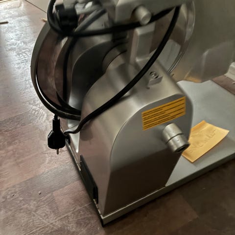 Sæt med blandet industrimaskiner og inventar til butik eller køkken. Inkluderer elektrisk pålægsmaskine i metal til skæring af kød og pålæg, kummefryser i hvid til frysning og opbevaring af varer, glas-køledisk i rustfri udførsel til præsentation og køling af fødevarer, barstol med sort sæde og lyse træben (der er 6 i alt), industriemhætte samt mindre displaykøleskab i sort med glaslåge til drikkevarer eller andre kølevarer. Velegnet til brug i café, kiosk, mindre restaurant eller lignende erhvervsmiljøer, hvor der er behov for både køleudstyr og siddepladser.