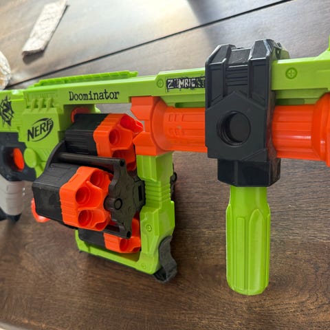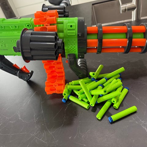 Nerf Ripchain legetøjsblaster i grøn og orange plast. Blasteren har roterende tromle og bæltelignende magasin til skumprojektiler. Egnet som udendørs og indendørs legetøj til børn, der leger kamp- og actionlege. Bruger skumammunition fra Nerf-serien. Sælges uden patroner.