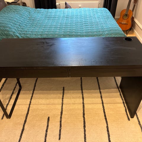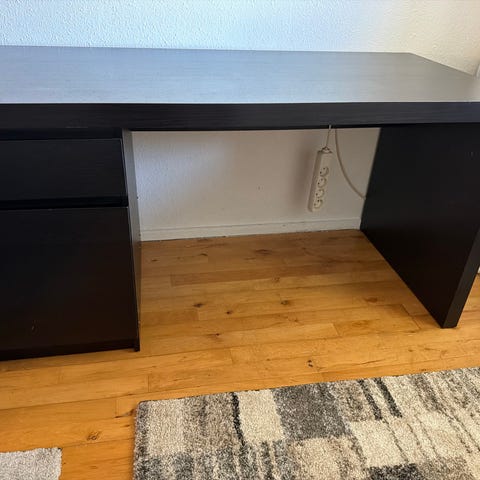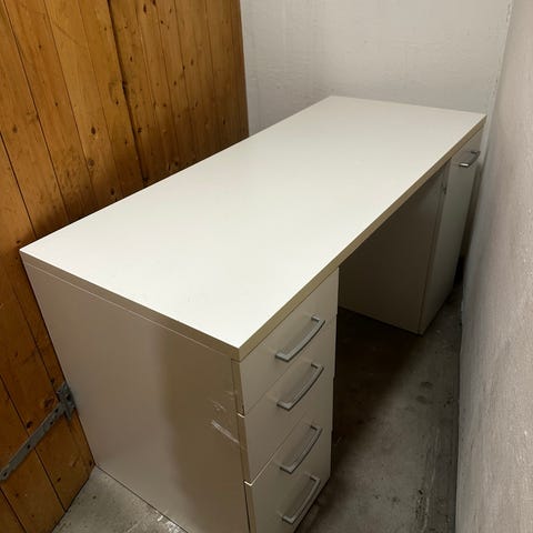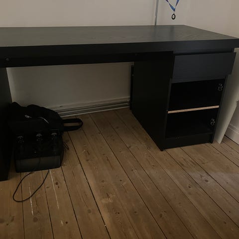 Skrivebord fra Ikea. Rummelig skrivebord med skuffe og hylde. Forlængerledning med stikdåser påmonteret og fås med. Normale brugsspor må påregnes med.