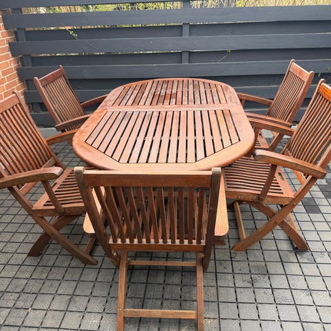 Solidt havemøbelsæt i træ, perfekt til terrasse eller have.