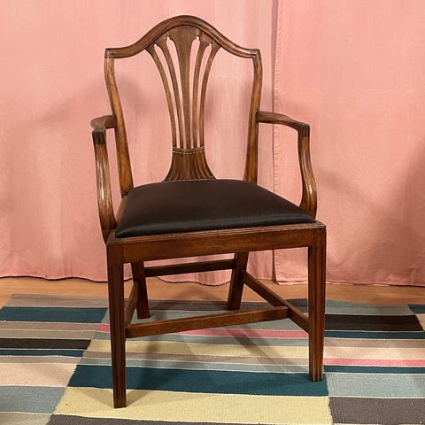 Mahogni stol med elegant rygdesign og stribet polstring, der tilføjer klassisk charme til ethvert rum.- Bemærk at mail, chat og beskeder ikke besvares, og varen skal købes på knappen "Gå til varen". Efter reservering af varen har du 10 dage til at afhente den i den butik, varen er på lager i.