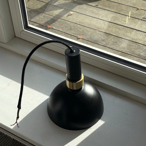 Kan desværre ikke huske designer, den skal have ny pære og muligvis skiftet sikring i kontakt da den i nogle lysstyrker har en lille svag summen, den kan justeres i lydstyrke.