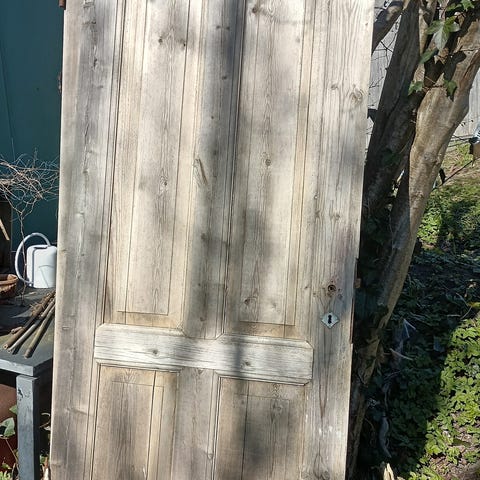 Gammel trædør fra et kælderrum. Har et knasthul, men er ellers i ok stand. Tung og gedigen. Kunne også bruges som bordplade til skrivebord eller lign bord. Er 168 cm høj, 73 cm bred og 2,5 cm tyk. Sendes ikke, men kan hentes på adressen.