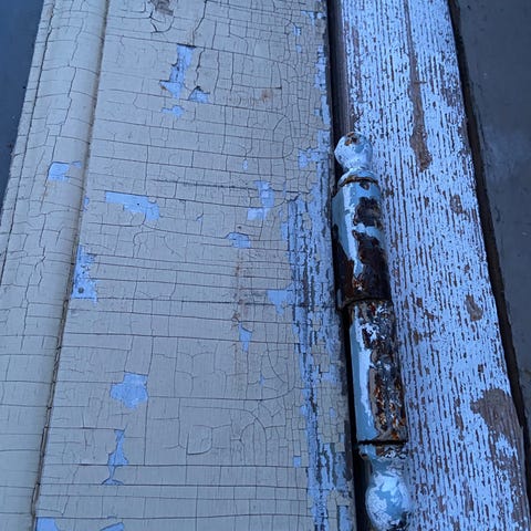 Den har 4 hængsler og er venstre hængt udadgående. Der er ikke råd, men trænger til maling.