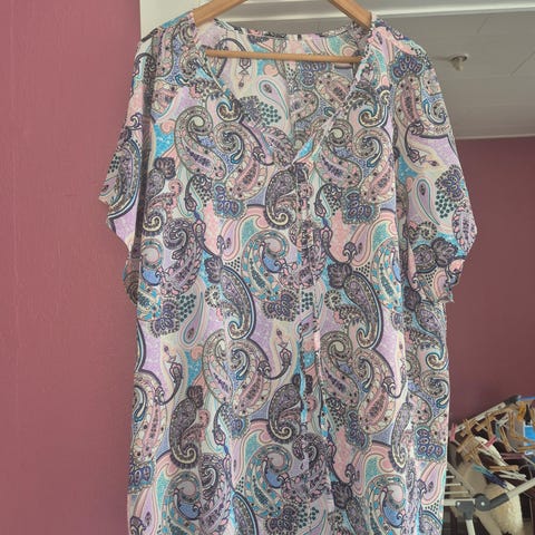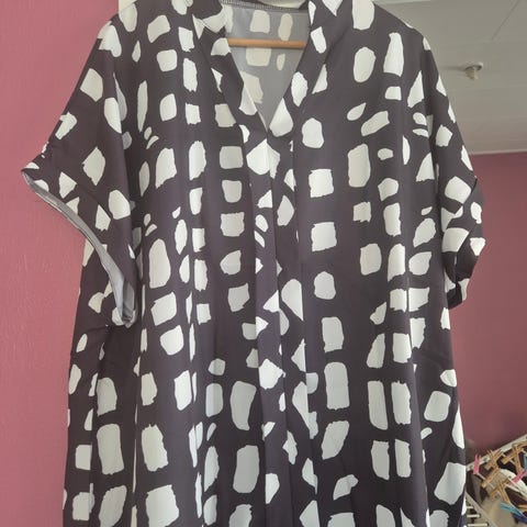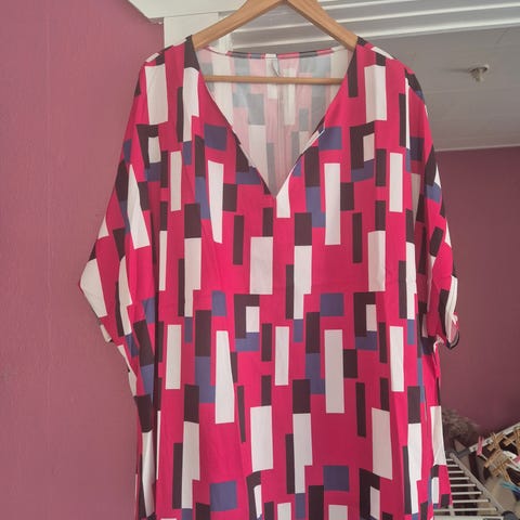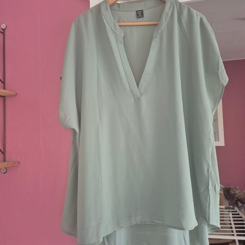 Dejlig skjorte/bluse til dame i størrelse 4XL. Ærmeløs model i grøn polyester med v-udskæring og lille knapdetalje foran. Løs og let pasform, velegnet til hverdagsbrug. Helt ny. Pris 65 kr
