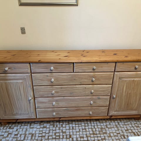 Skænk i massiv egetræ med tre skuffer og låger. Har stået til pynt og aldrig været brugt.