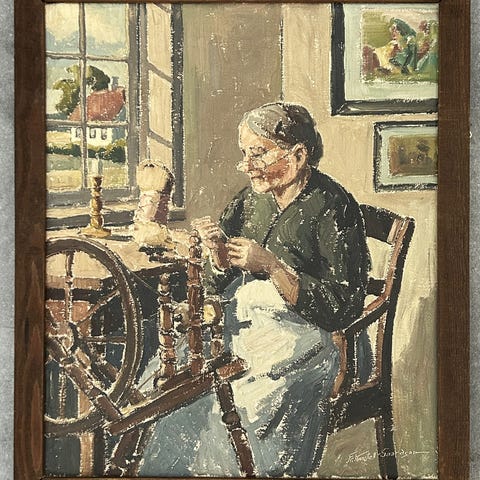 Fint maleri af kvinde ved spinderok i ramme.