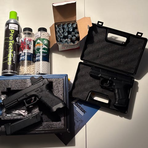 Der medfølger 2 ekstra magasiner samt maske, skydeskive, nogle kugler og ektra patroner