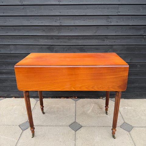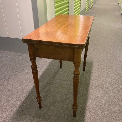 Antikt spillebord /Konsolbord i mahogni med drejede ben. Rektangulær bordplade og klassisk udtryk, velegnet som sidebord eller afsætningsbord i entré, stue eller gang. Bordet står på fire slanke ben.