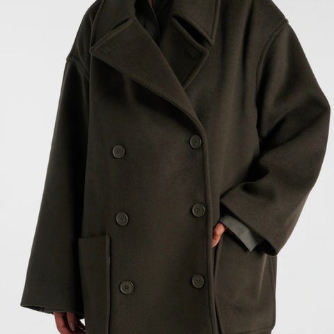 Kort frakke i en blød, lys nuance med dobbeltradet lukning og bred sjalskrave. Det minimalistiske design og den afslappede pasform giver et tidløst og elegant udtryk.