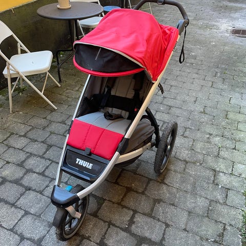 Thule Urban Glide 2 løbevogn med tre hjul i sort. Vognen har stort forhjul og to baghjul med luftdæk samt affjedring på bagakslen. Perfekt til løbetur både på vej og skov