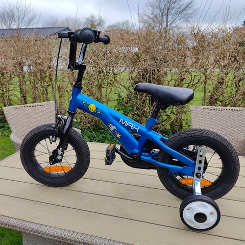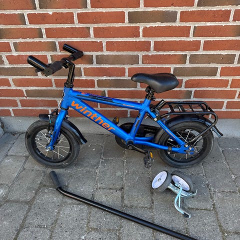 børnecykel med 12" hjul i blå farve. Cyklen har støttehjul, kædeskærm og skærme for og bag. Den er udstyret med reflekser og børnesadel samt børnestyr med håndbremse. Velegnet som første cykel til mindre børn, der skal lære at cykle på en cykel med 12" hjul.