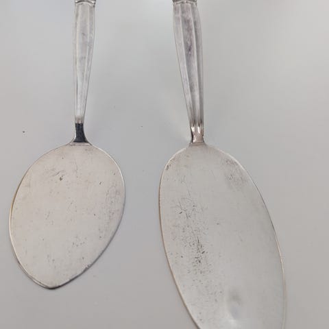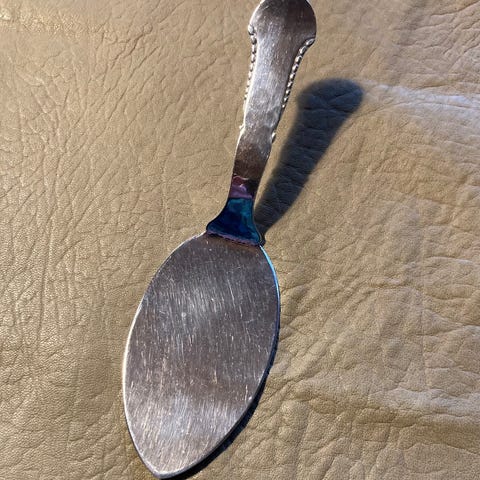 sølv kagespade med mørkt skaft. Kagespaden har et ovalt blad i sølv med stempler på skaftet og et mørkt, formet skaft, der kan være af træ eller andet materiale. Velegnet til servering af kager og desserter. Designet har dekorative detaljer ved overgangen mellem blad og skaft.