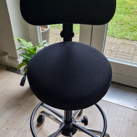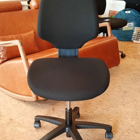 RH Activ 220 betrukket med sort Fame stof. Activ 220 er en lækker kvalitetsstol, som indbyder til en aktiv og varierende siddestilling igennem hele arbejdsdagen. Stolen har en siddehøjde, som kan indstilles fra 43-57 cm. Derudover kan rygstykket højdejusteres og det samme kan sædedybden. Stolen har desuden trinløs justering af rygvinklen og free-flow sædevip. Hjul: Velegnet til hårde gulve. Stolen er med almindelige brugsspor. Lagerbestand: 1 stk.